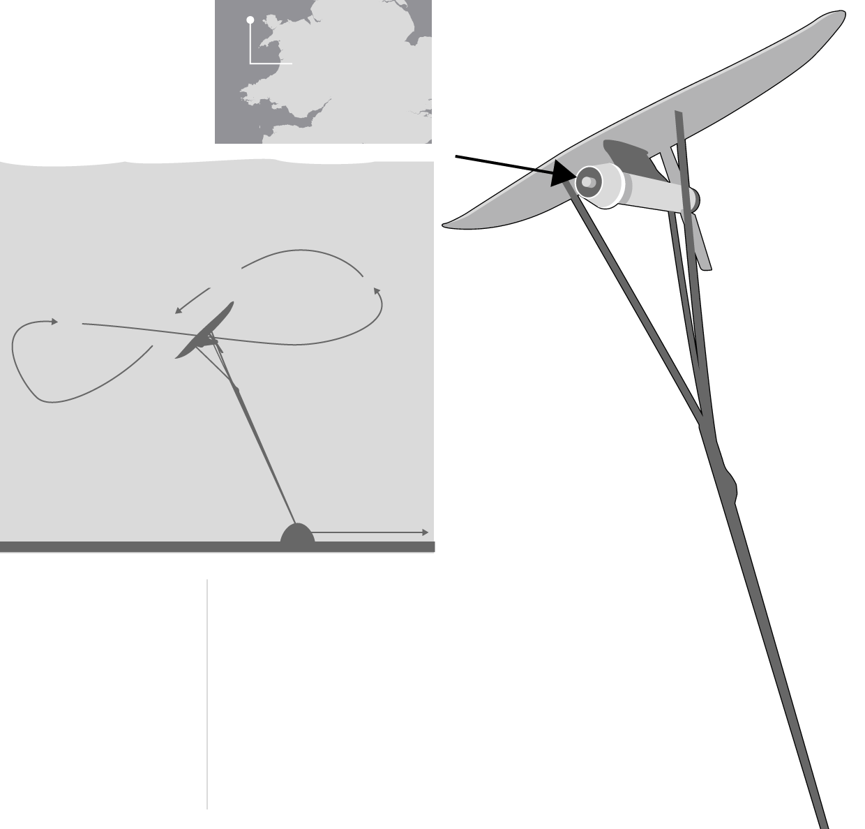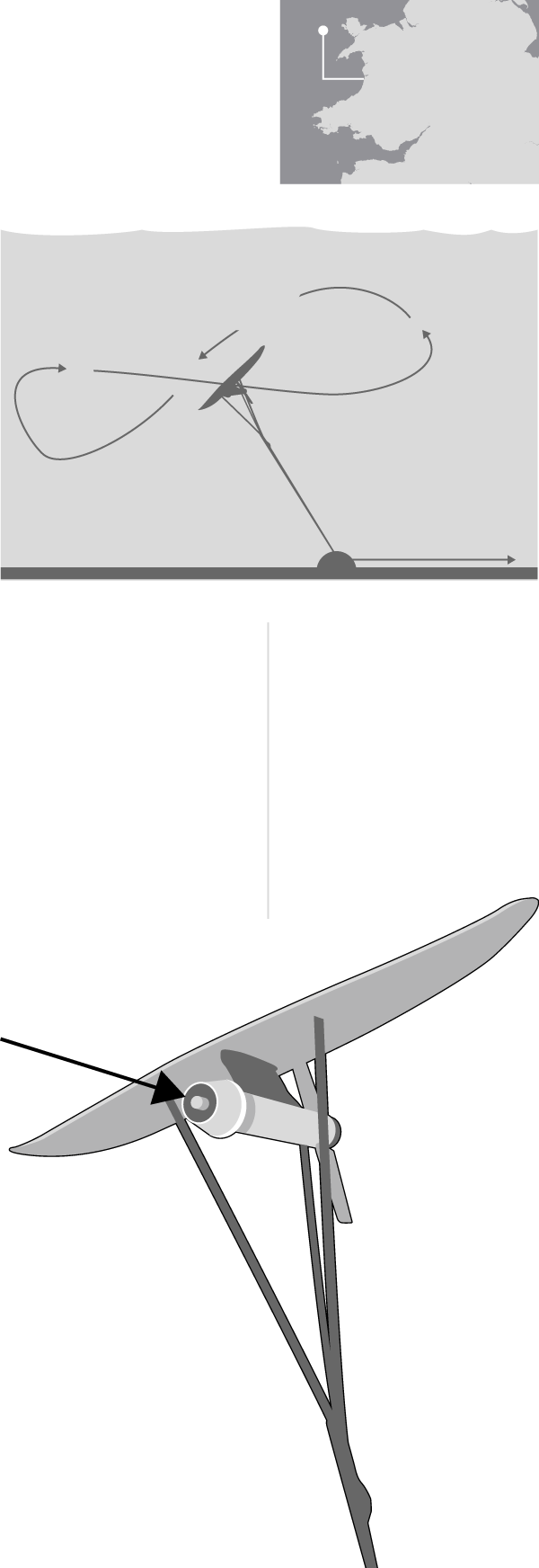 Each turbine is suspended beneath a rigid kite and tethered to the sea bed.