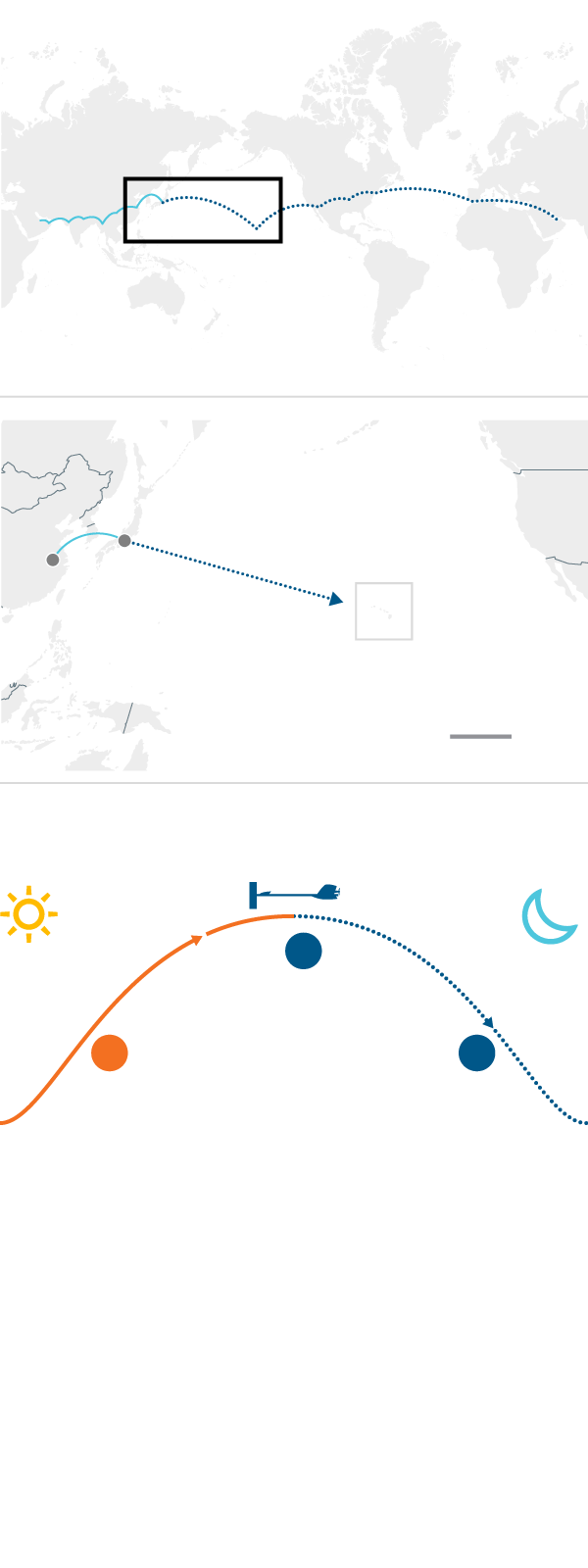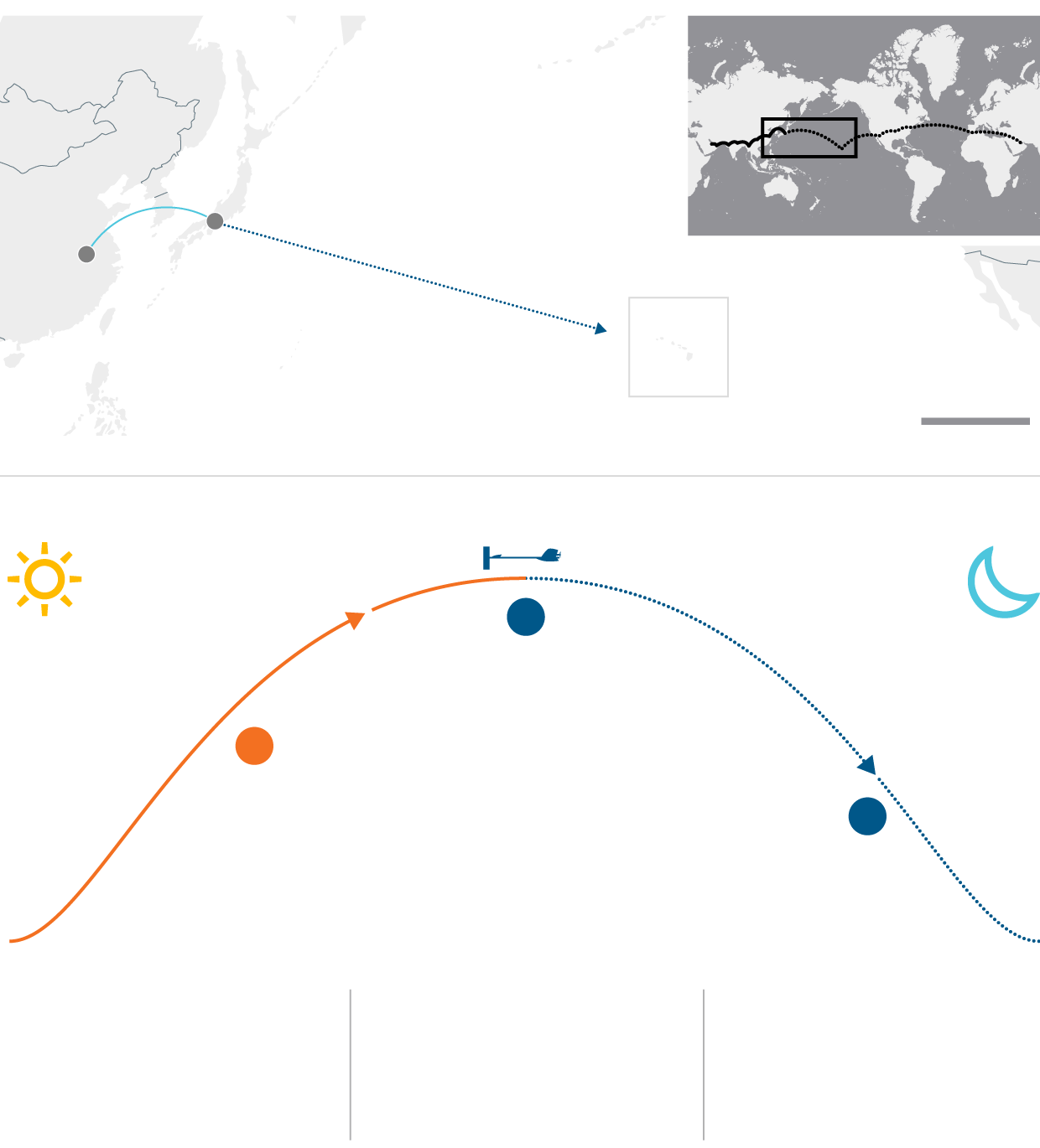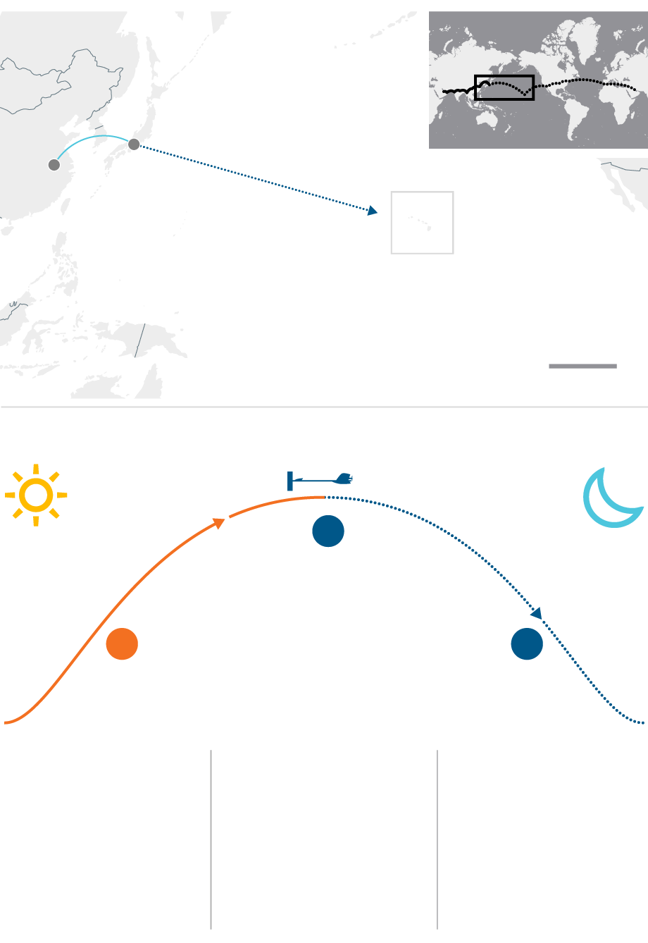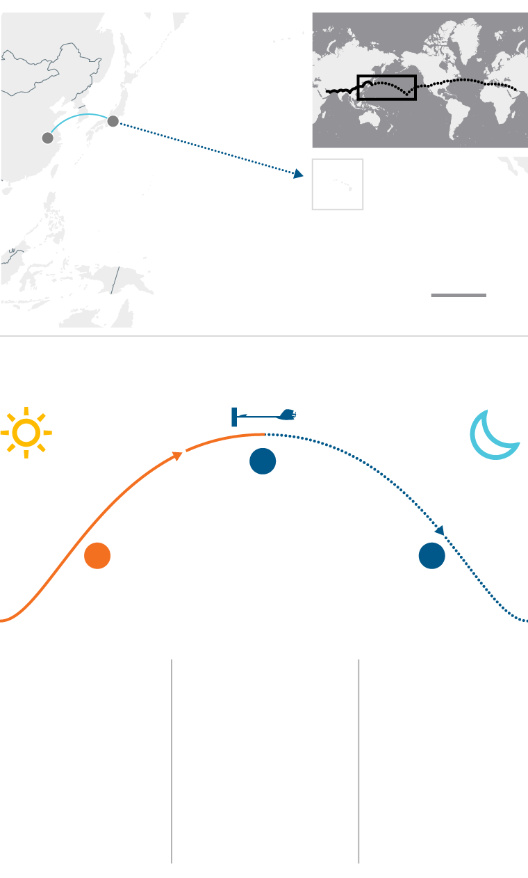 Plane takes off in daylight. It rises to an altitude of 9,000m as the sun charges its batteries