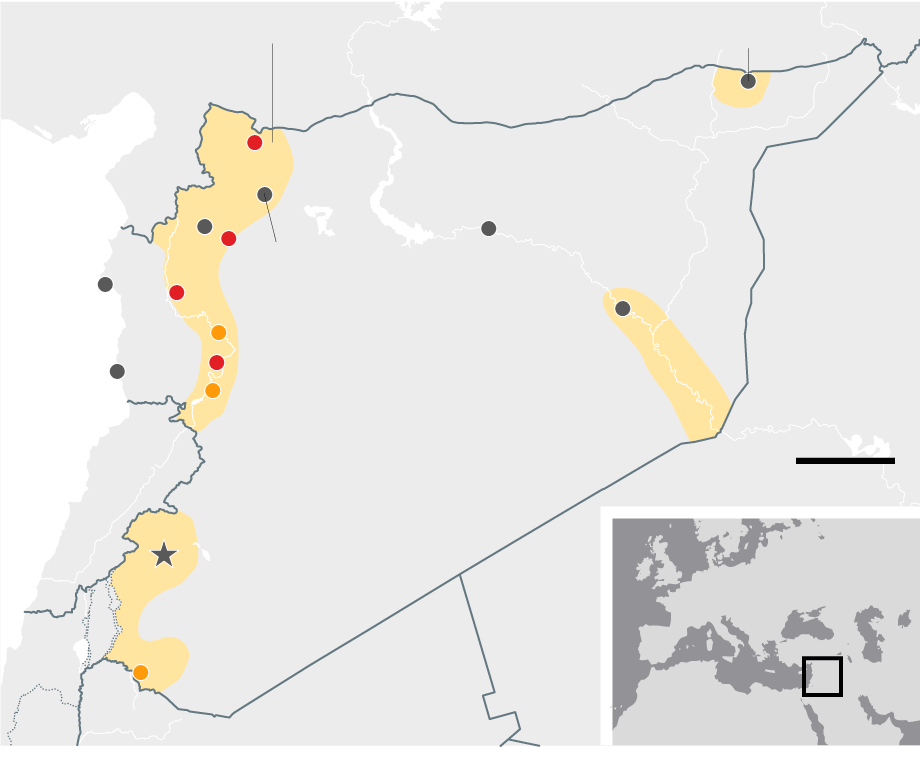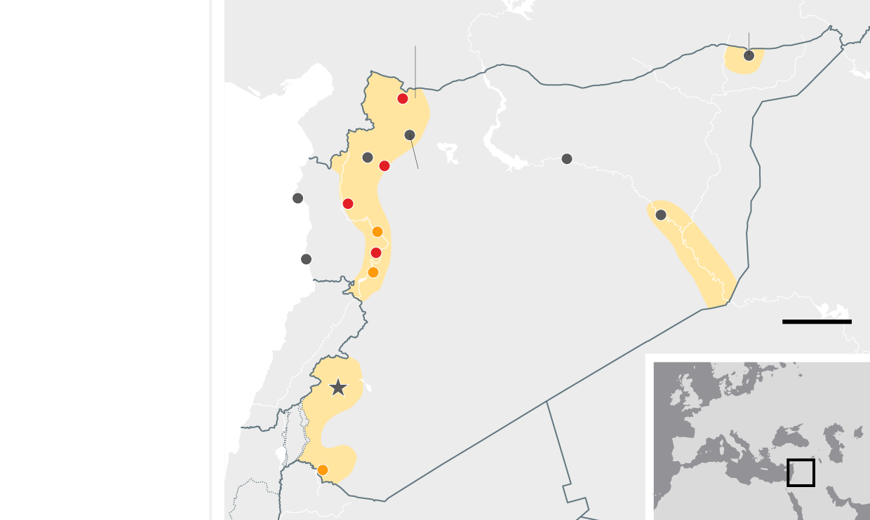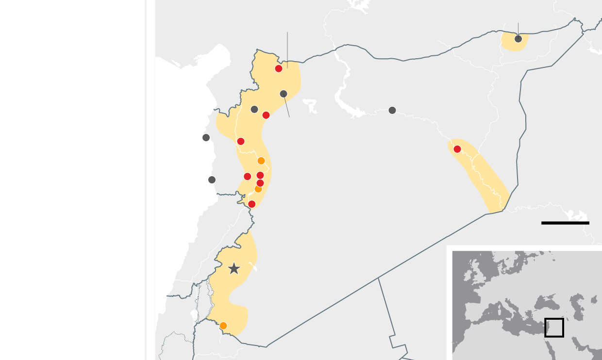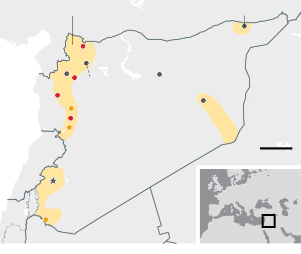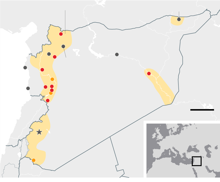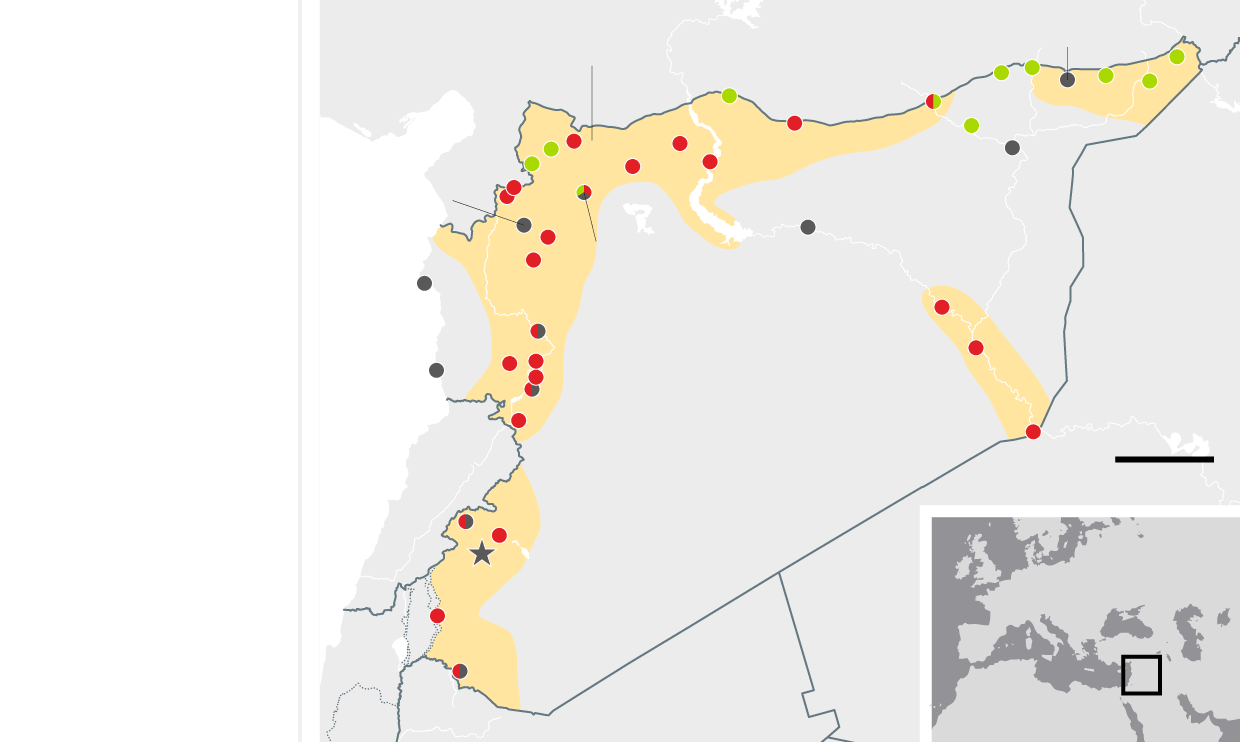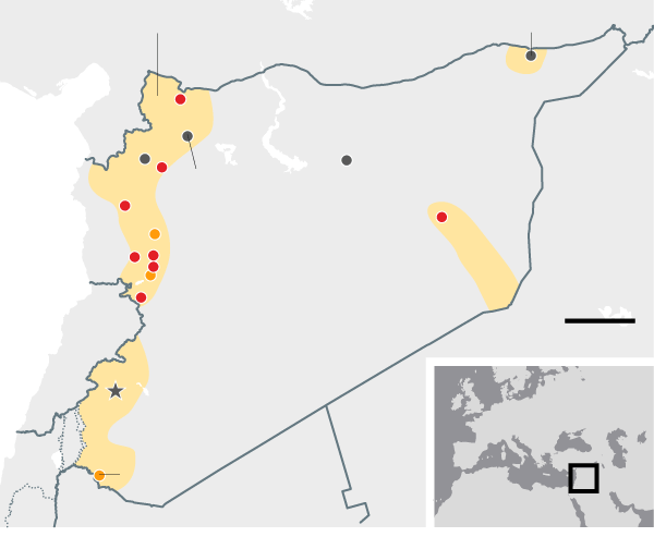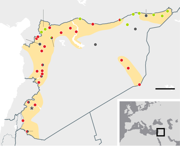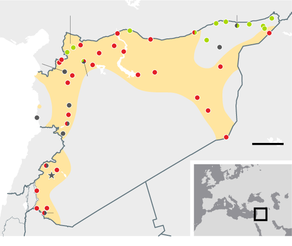 August 2014 Government forces make advances north, leaving the al-Qaida-aligned Islamists of Jabhat al-Nusra penned in, along with the diminished fighters of the secular opposition, who still retain a foothold in the south. Isis captures an airbase in the east and consolidates its 'caliphate' after lightning advances through Iraq in the summer.
