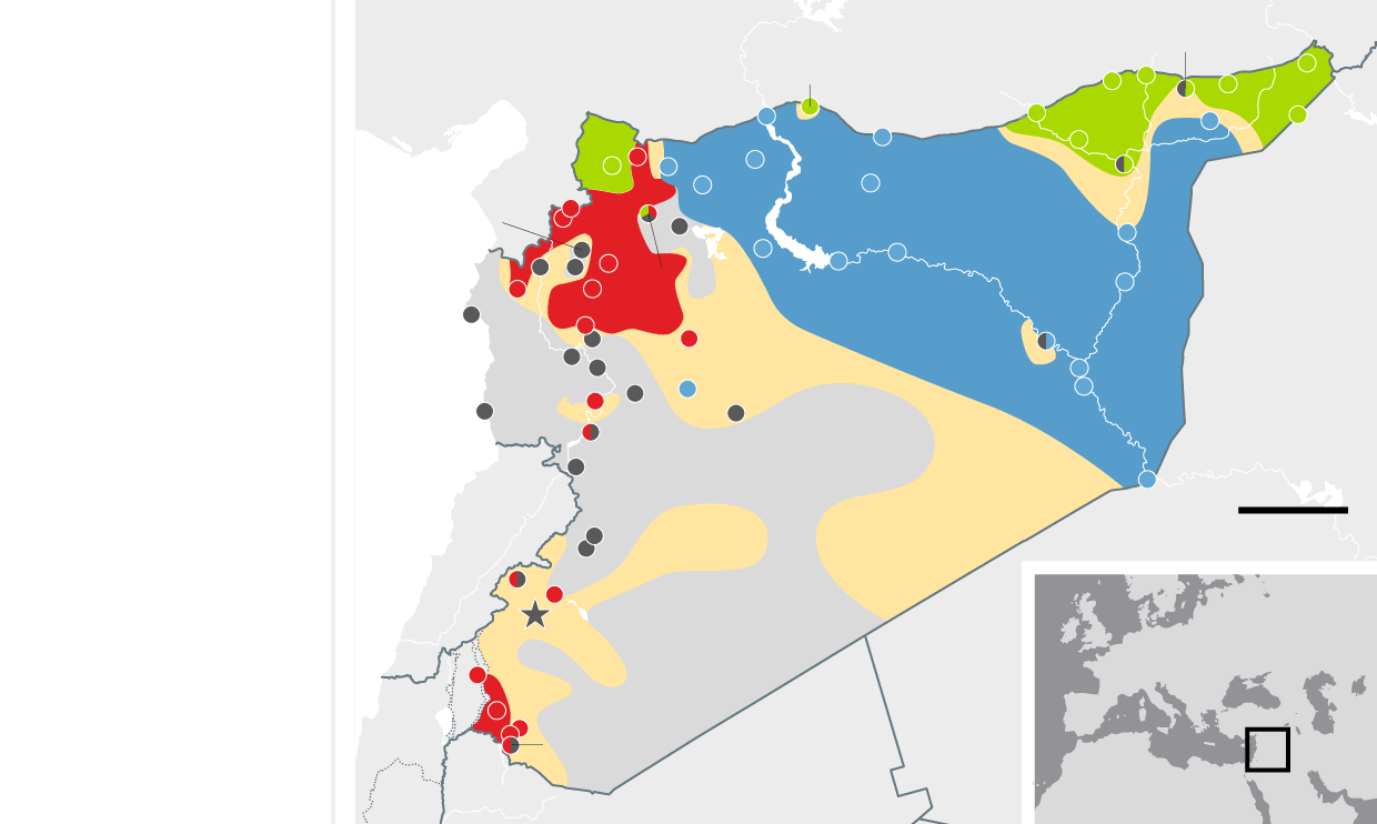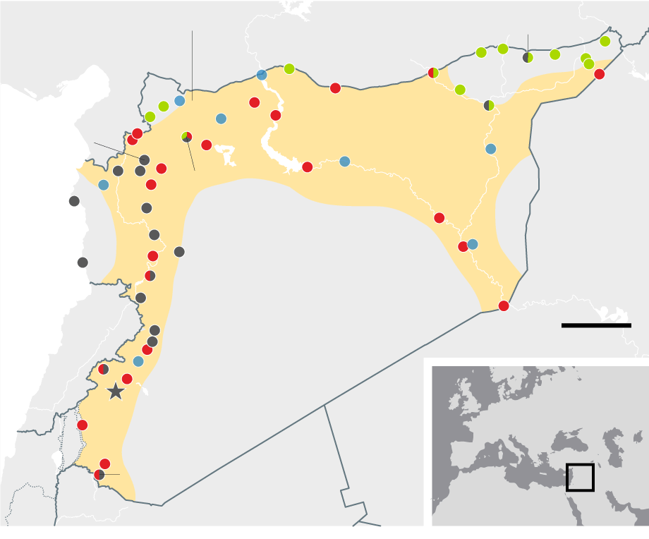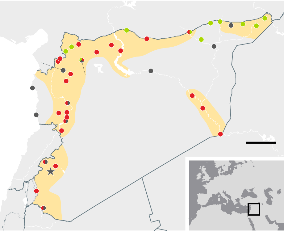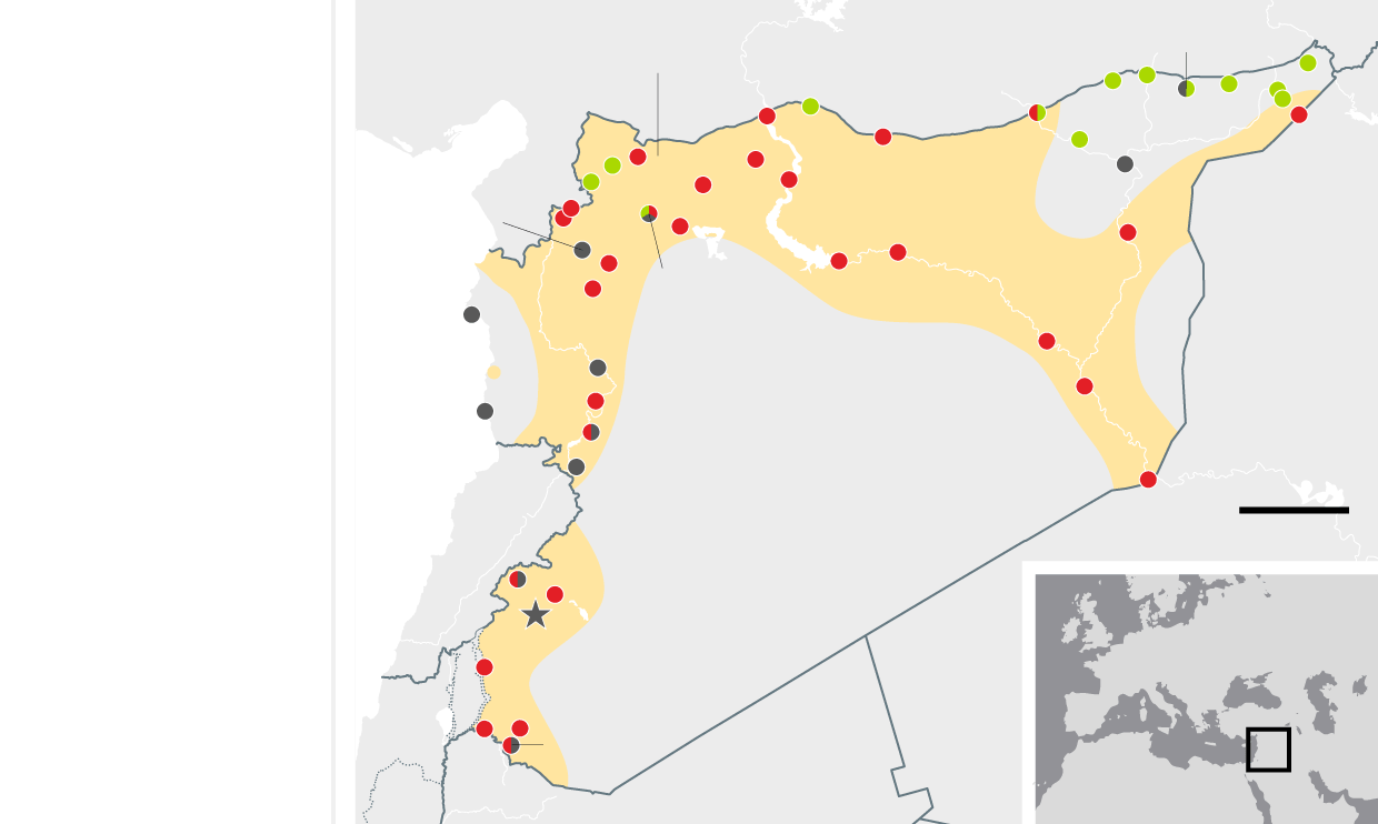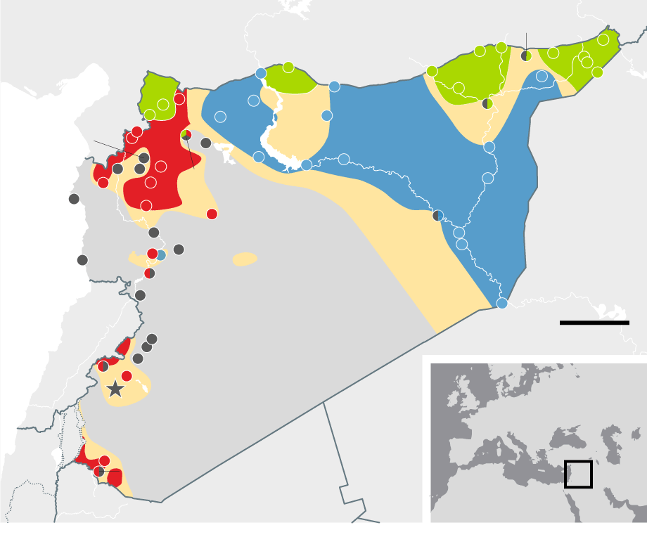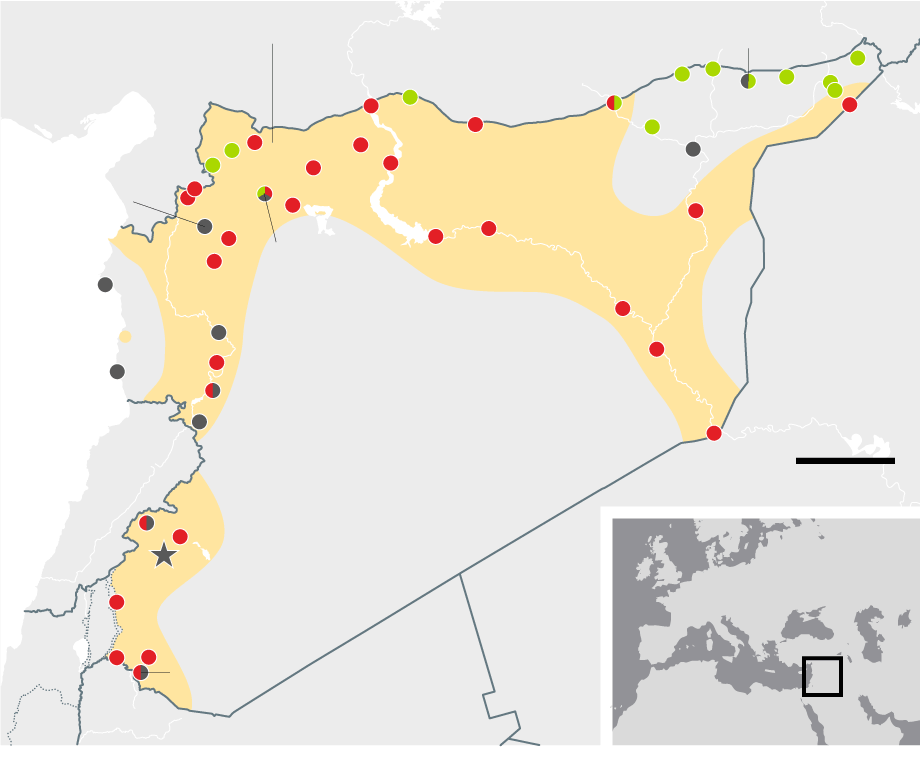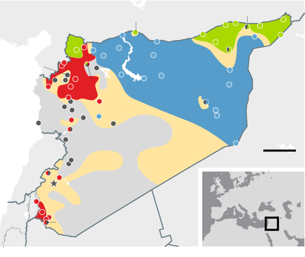January 2015 Weakened by US air strikes, Isis finally gives up its assault on Kurdish-held Kobani in the north after an epic siege, prompting speculation that it might prove vulnerable to a ground offensive. Assad's forces continue to hold all major urban centres with the exception of Aleppo, which remains divided almost four years after the uprising began.
