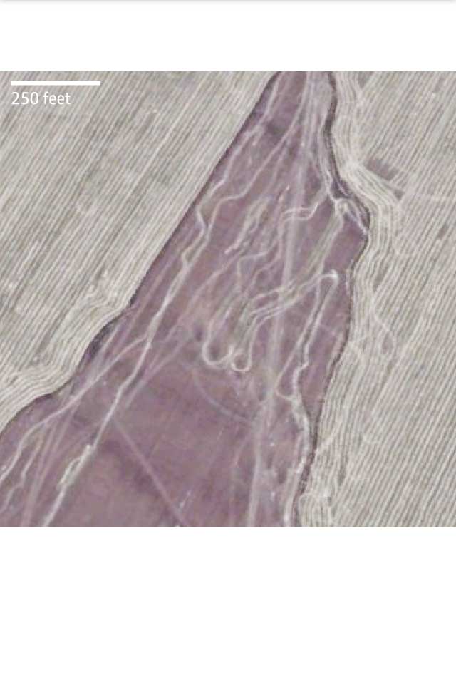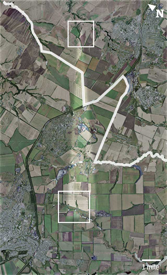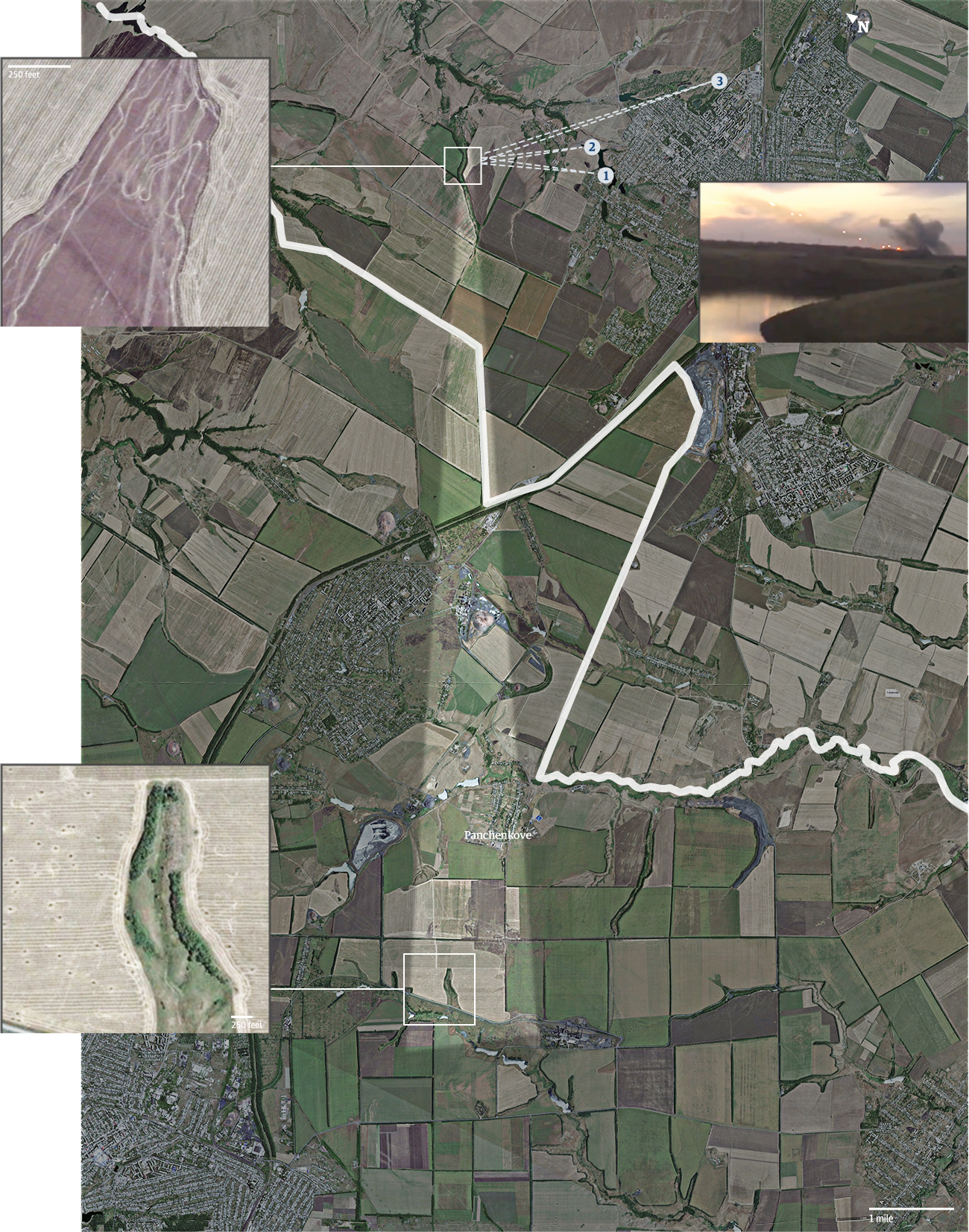 Satellite imagery shows scorch marks and vehicle tracks heading deeper into Russia at the end of a trajectory calculated from craters near Panchenkove in Ukraine