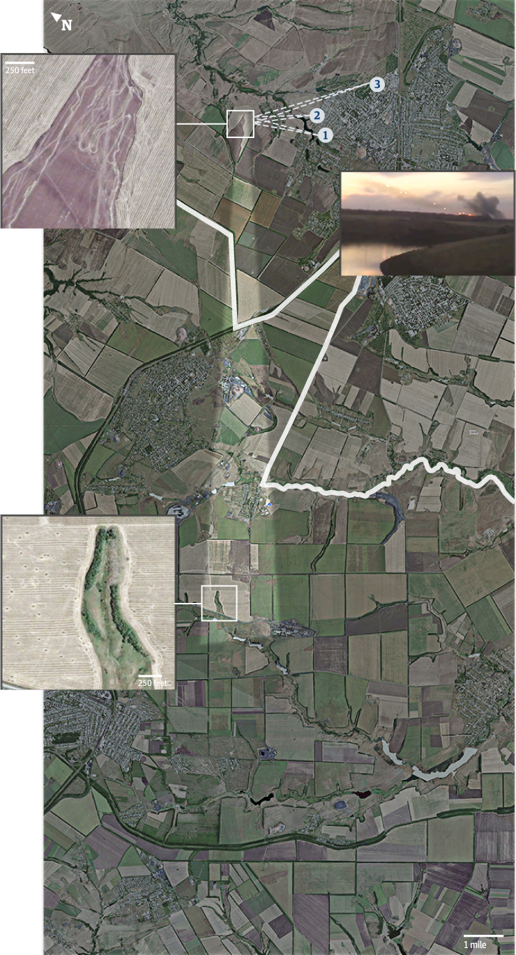 The Bellingcat team studied satellite imagery of the area near Panchenkove where Ukrainian media reported attacks in July. After locating a crater field, they calculated the trajectory of 813 craters to five suspected firing positions. Four of these sites were within Russia, including an area near Gukovo.