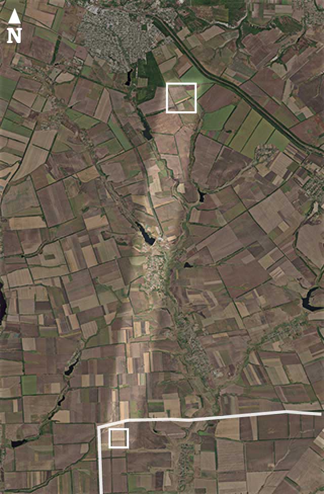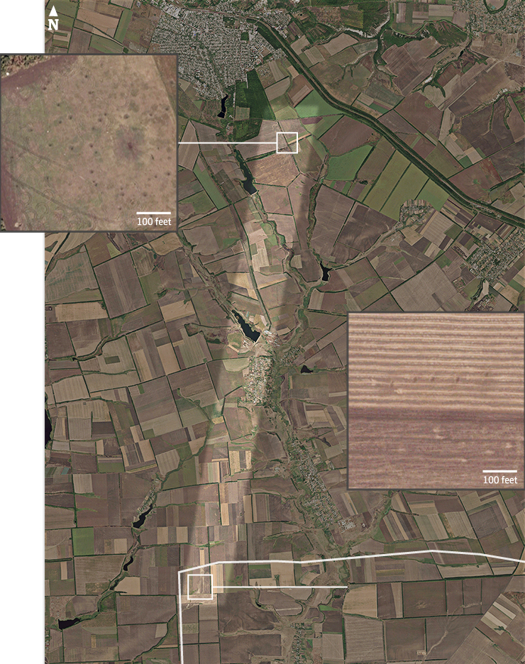 Using satellite imagery dated 16 July 2014, Bellingcat analysed the shapes of 330 visible craters to trace an average trajectory to a site 14.6km across the border near the Russian village of Seleznev.