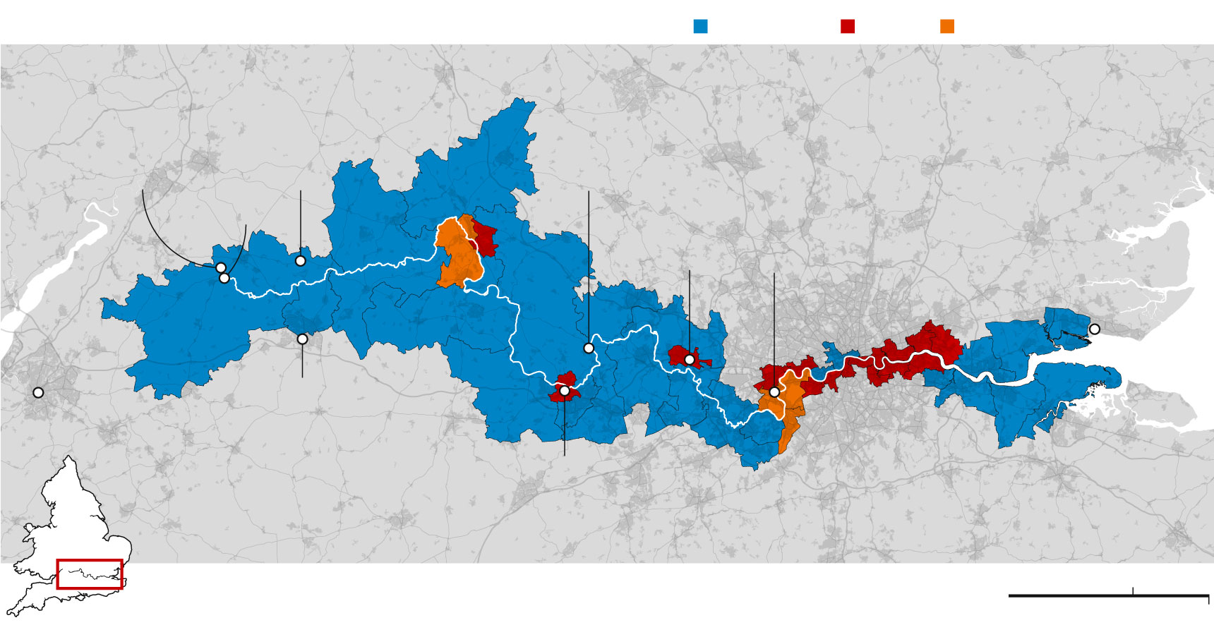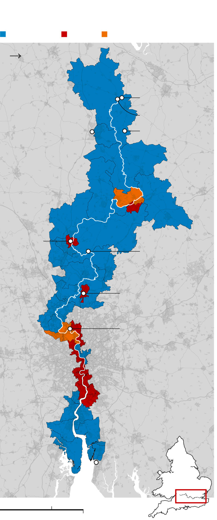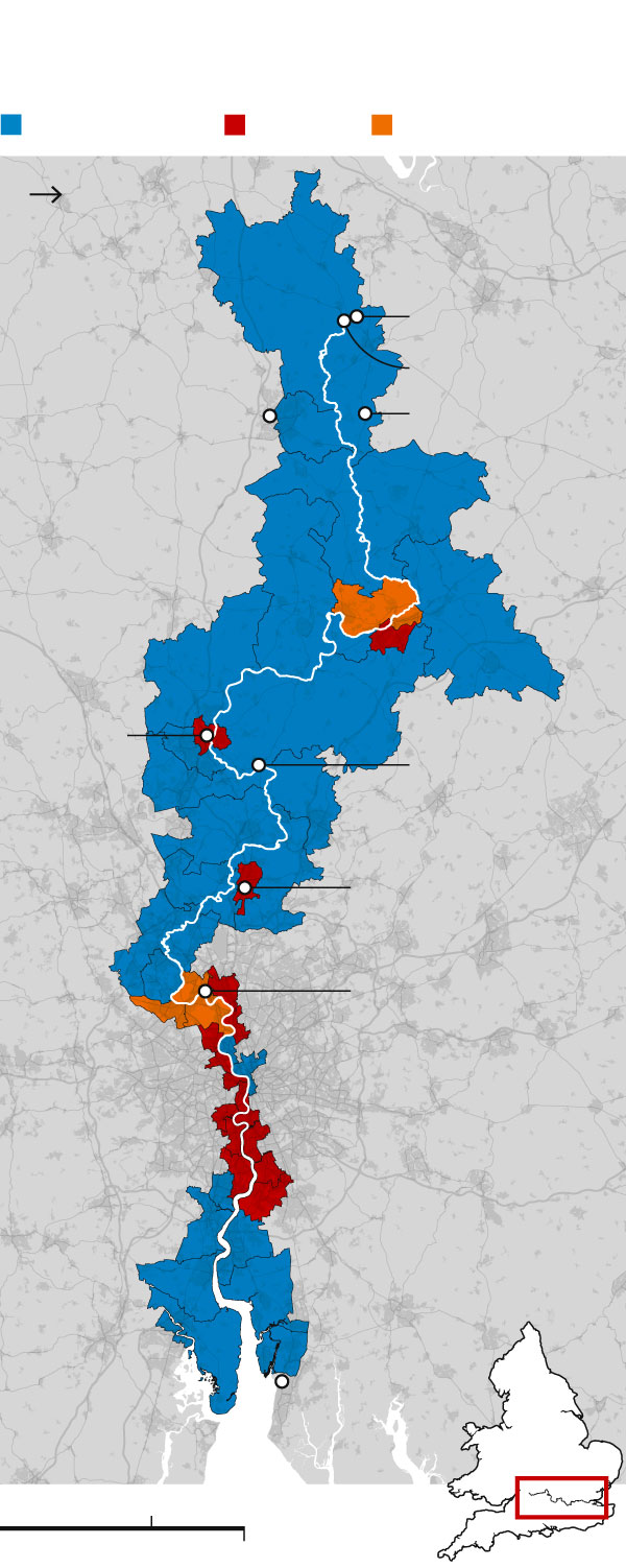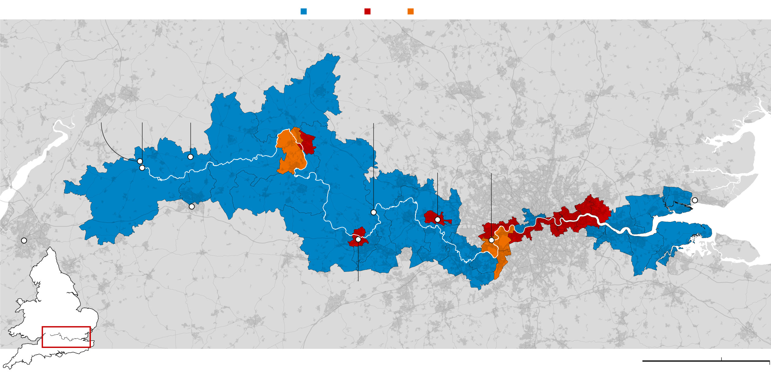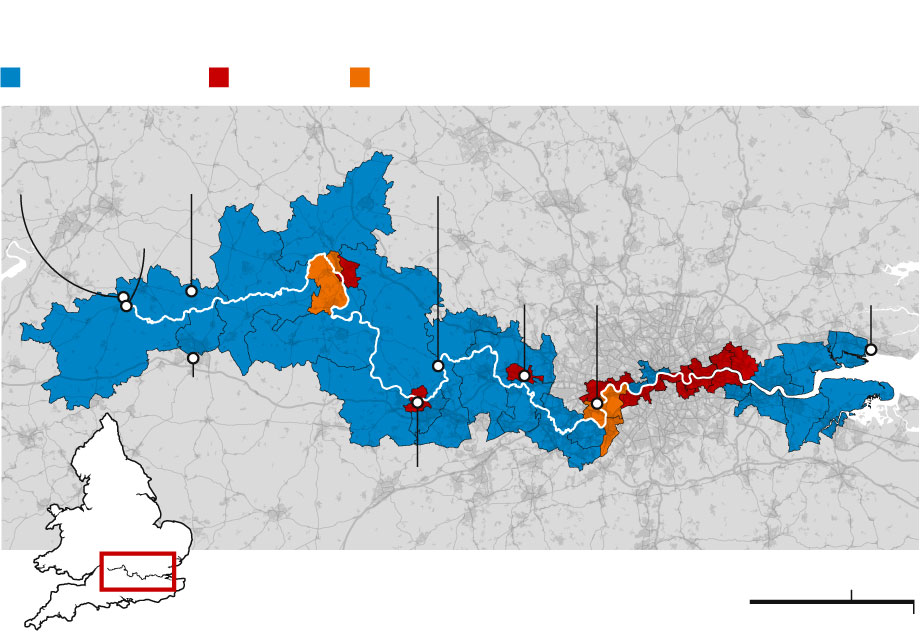 New constituency boundaries along the Thames by their modelled 2019 results