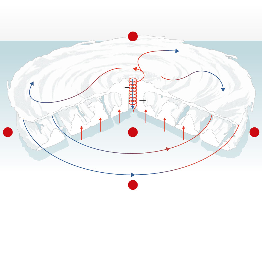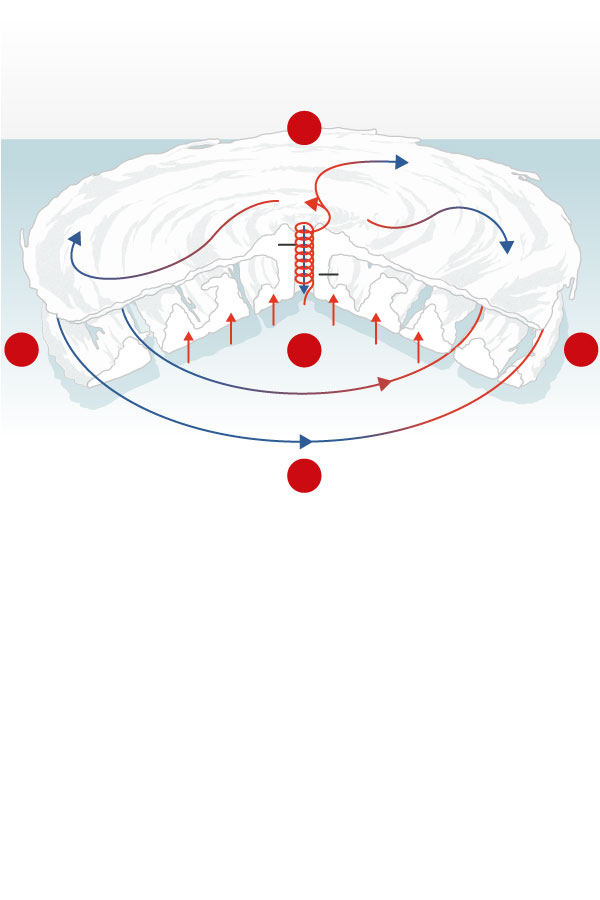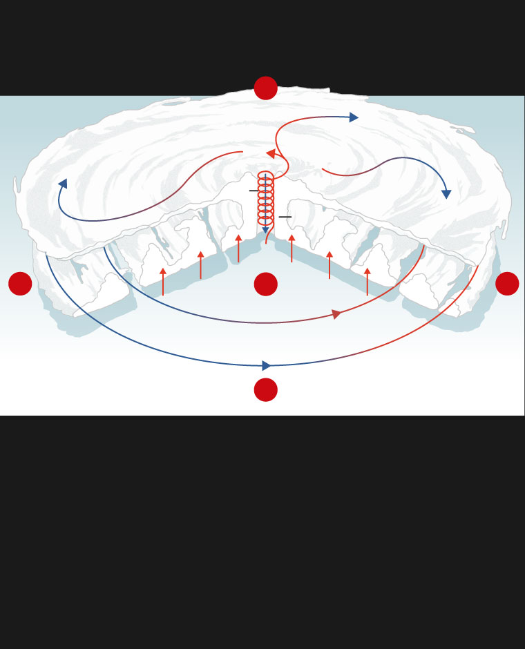 4. The system spins as air rushes to the centre to fill the low pressure void