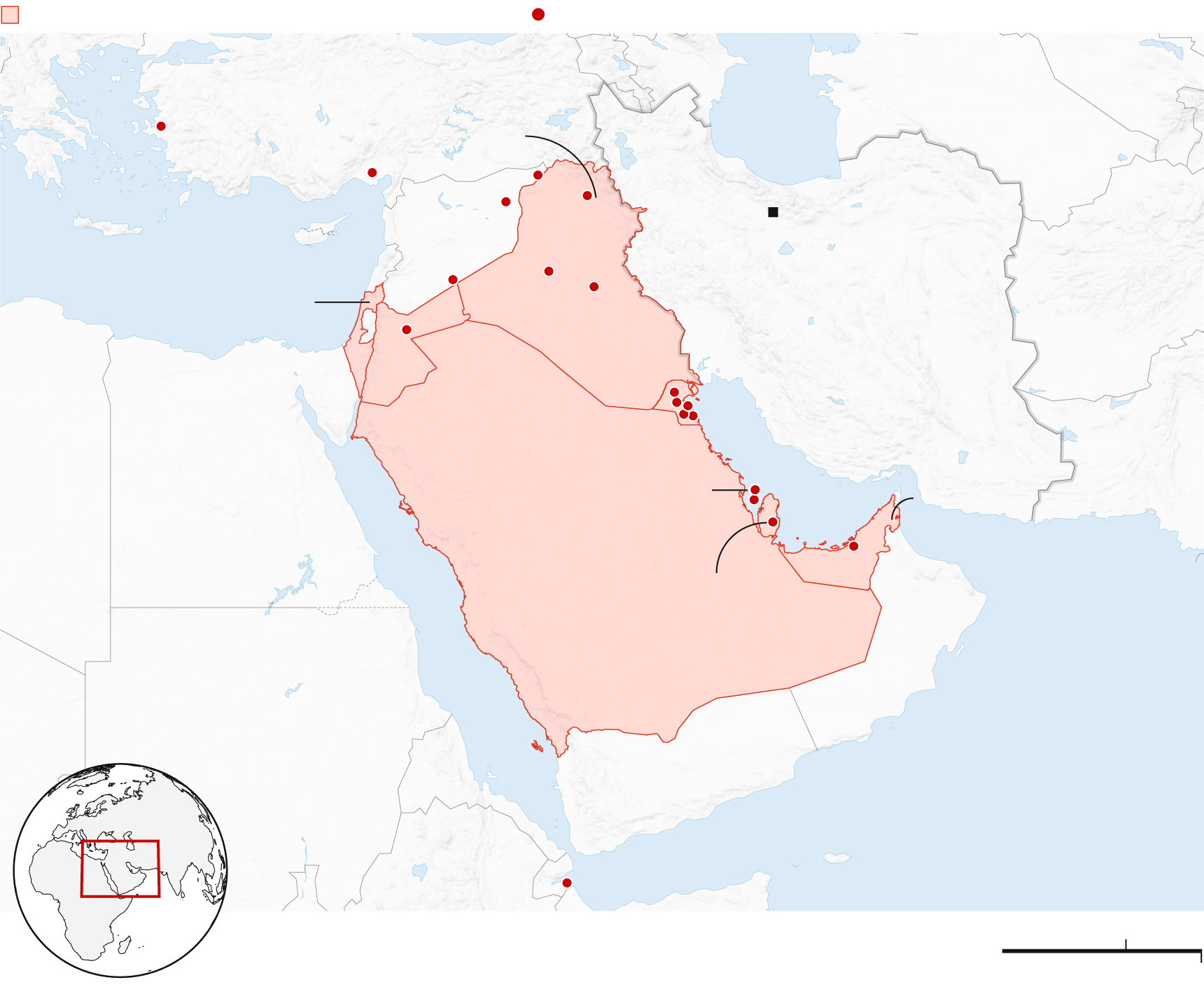 Countries/regions targeted by Iranian strikes,
