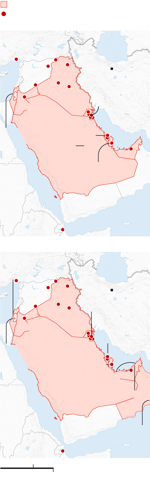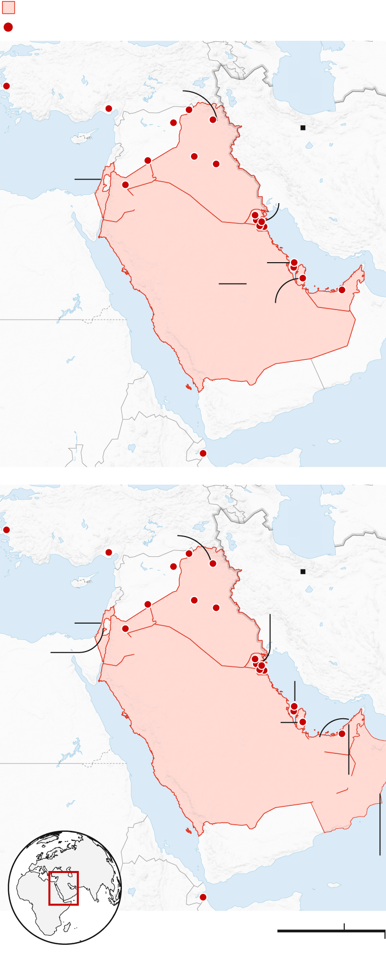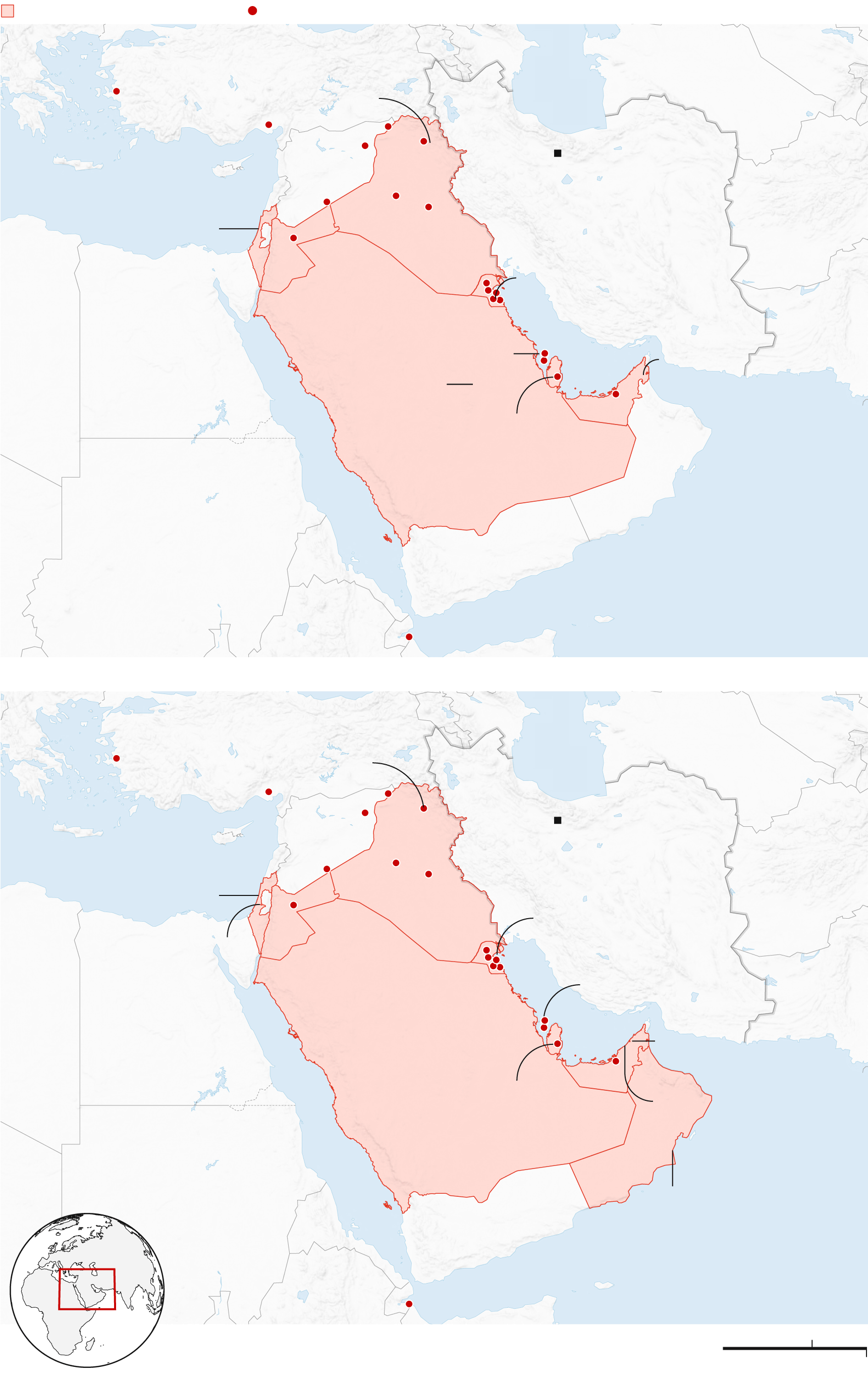 Countries/regions targeted by Iranian strikes, 28 Feb 2026