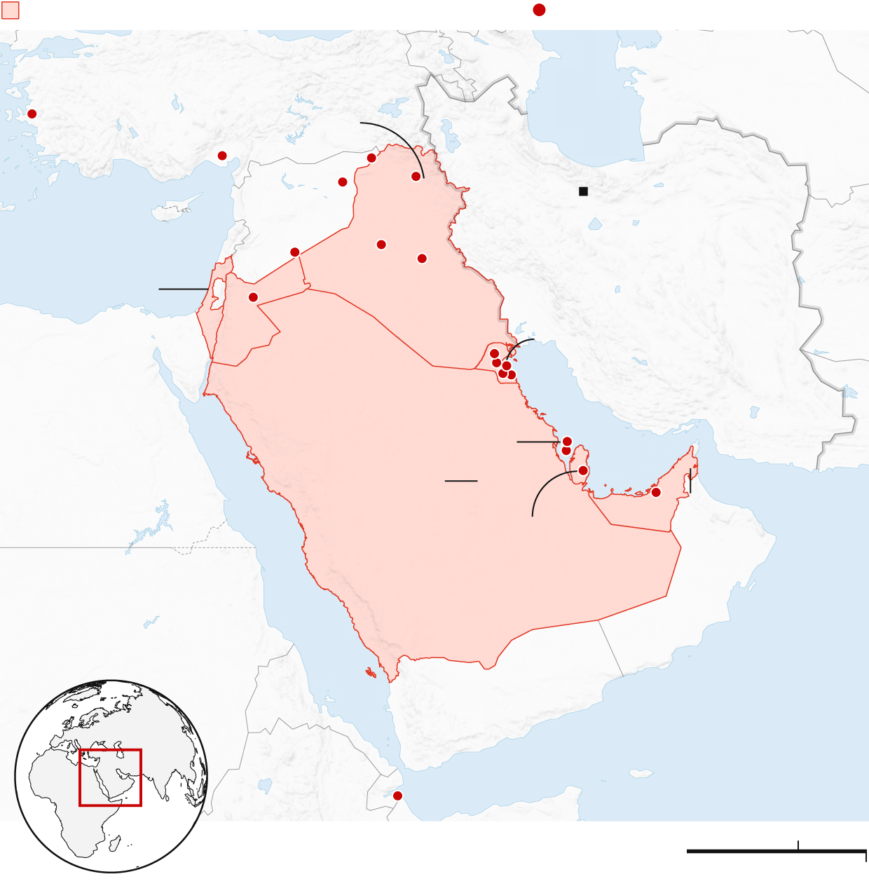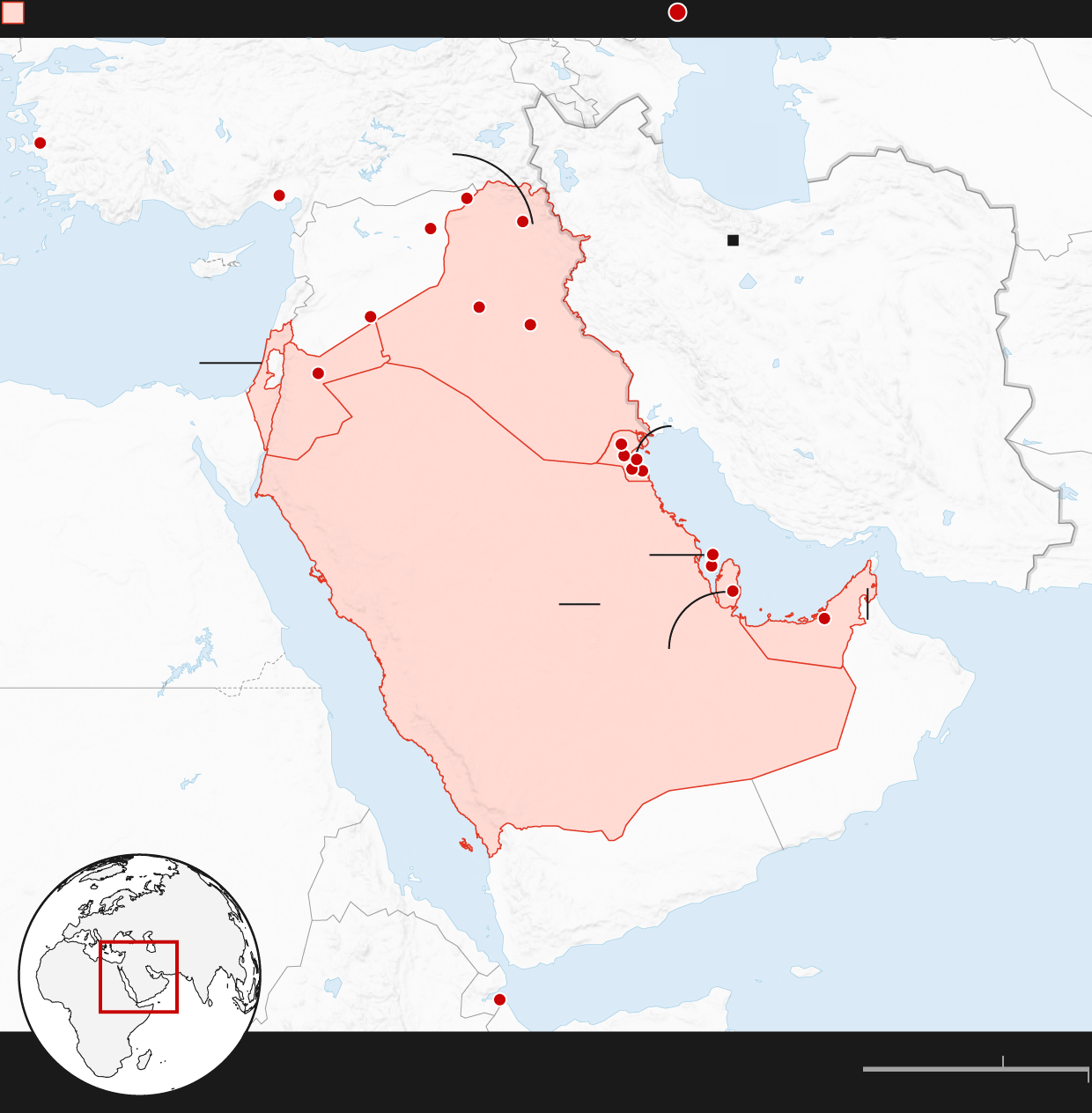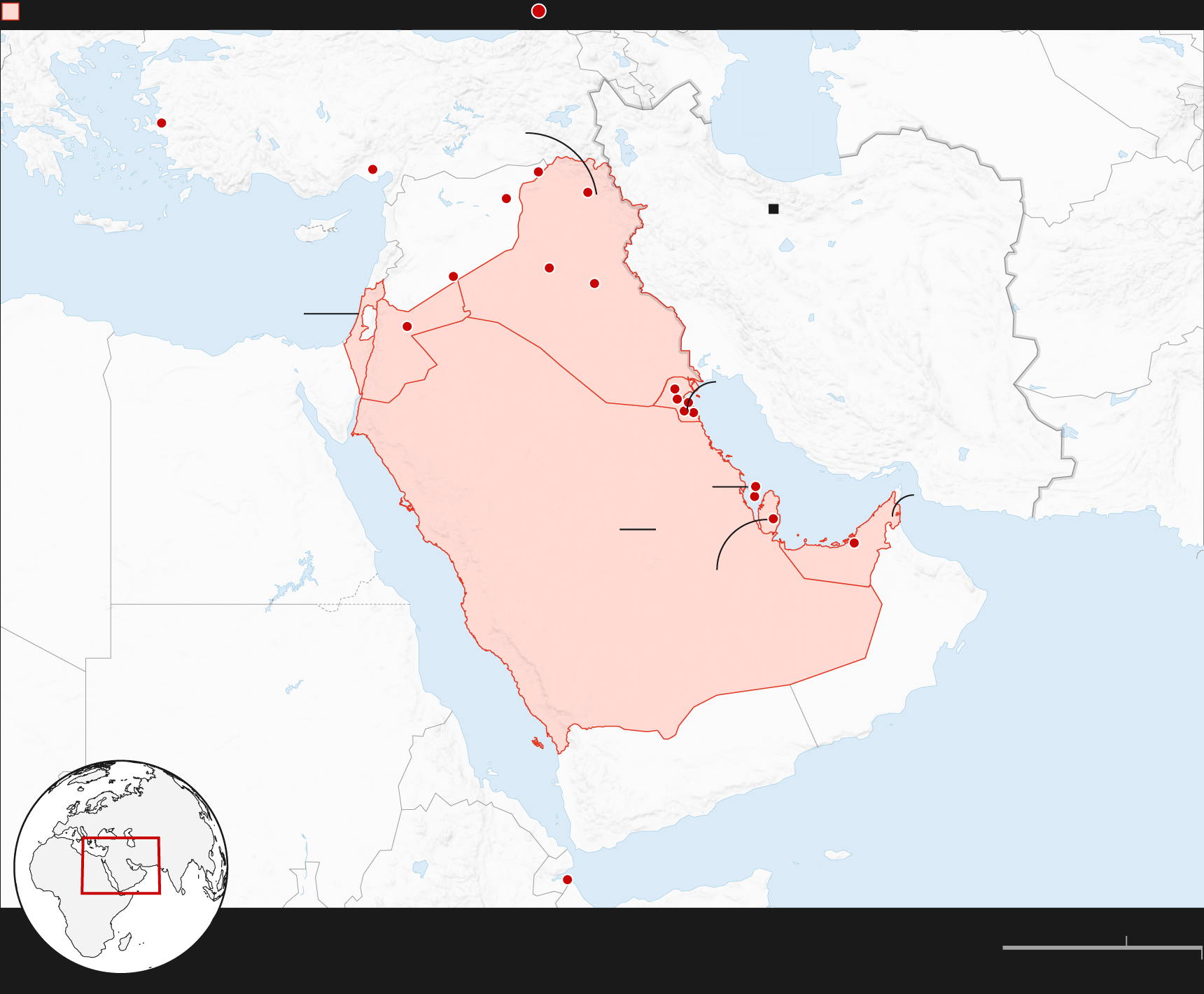 Countries/regions targeted by Iranian strikes,